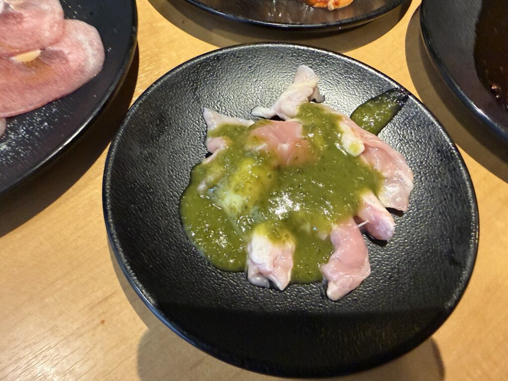 焼くとコリコリとしつつジューシーでいくらでも食べられそうな感じですが、これに青唐辛子ソースがまたいい感じです。